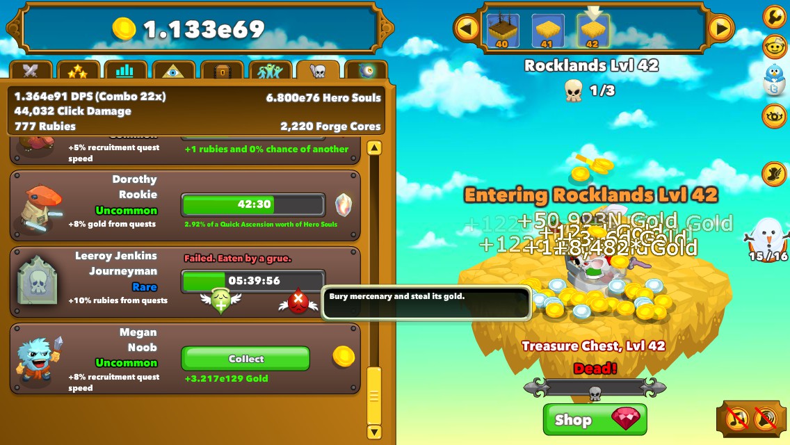 【Clicker Heroes】残りの実績Leeroy Jenkinsのみ。-山城ブログ あと、Leeory Jenkinsのみです。 私自身、Clicker Heroesは長い間プレイしていますが、今まで一回もLeeroy Jenkinsのmercenaryを雇用したことない。 色々調べましたが、日本の情報は無いに等しかったので、海外のredditやsteamコミュニティ等から情報を得ました。