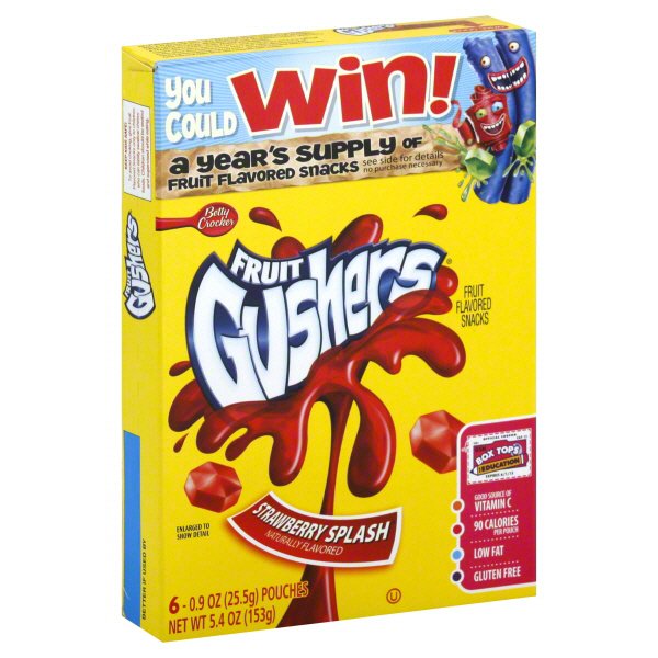 Fruit Gushers (History, FAQ, Flavors & Pictures) 14 Fruit Gushers Ingredients and Nutritional Information - Strawberry Splash; 15 Fruit Gushers Nutrition; 16 Fun Recipes; 17 Fruit Gushers Questions And Answers. 17.1 Does Fruit Gushers have a mascot? 17.2 What year was Fruit Gushers first made? 17.3 How many gushers come in a bag? 17.4 What company makes Fruit Gushers?