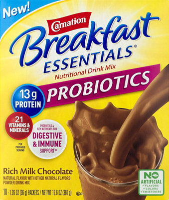 Pros and Cons of Carnation Instant Breakfast - Verywell Family Depending on the flavor or variety, each Carnation Breakfast Essentials product has slightly different nutritional information, but each product contains 20% or more of daily protein needs, plus 21 vitamins and minerals, including vitamin D, calcium, iron, zinc, and vitamin B12.