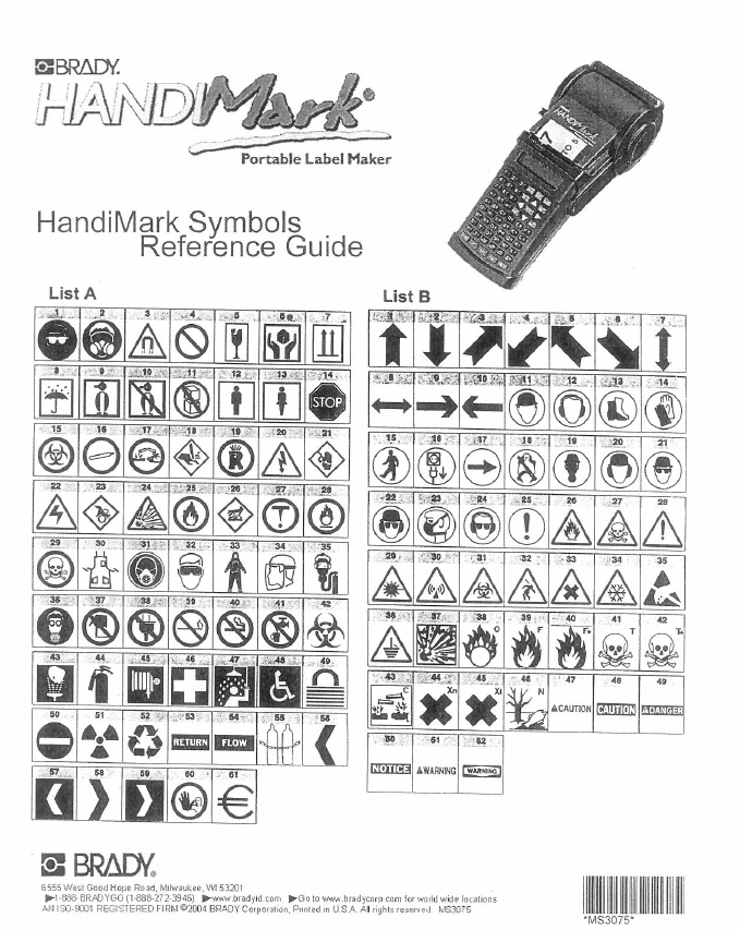 PDF Portable Label Maker HandiMark Symbols Reference Guide List A List B ... Portable Label Maker HandiMark Symbols Reference Guide List A List B RETURN FLOW west Good Hope Road. Milwaukee, 53201 to corn wide AN REGISTERED BRADY Corporation. USA A . Title: Scanned Document Created Date: