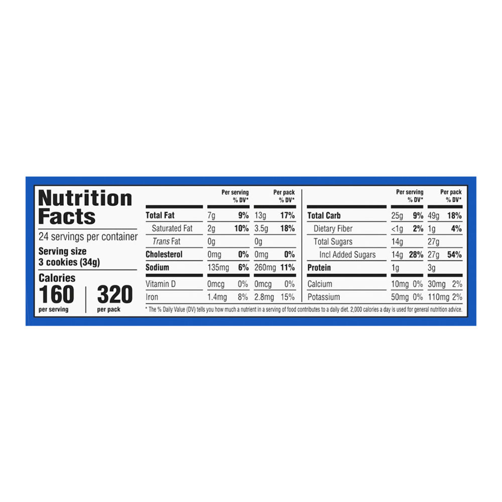 Nabisco Oreo Sandwich Cookies Chocolate 14.3 oz - SmartLabel™ Total Sugars 14 g. Added Sugars 14 g 28.0%. Protein 1 g. Vitamin D [Total (mcg)] 0.0%. Calcium 0.0%. Iron 8.0%. Potassium 0.0%. * The % Daily Value (DV) tells you how much a nutrient in a serving of food contributes to a daily diet. 2,000 Calories a day is used for general nutrition advice. Calories per gram: