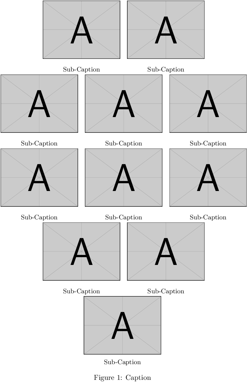 overleaf - How to put many subfigures side by side in latex to fit a ... 1 You can use \ContinuedFloat from the caption package to split your figure in two. In case you have problems with other text from your document interfering with the figure, add \clearpage before/after it.