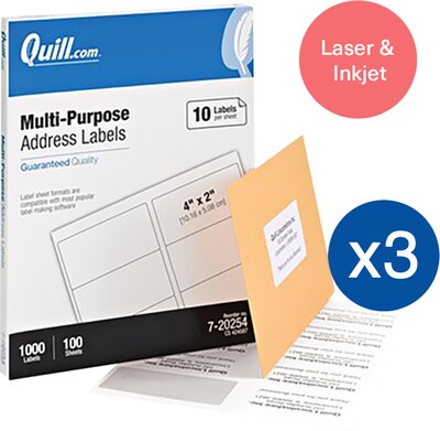 Quill Brand® Laser/Inkjet Address Labels, 2" x 4", White, 3,000 Total Labels (Comparable to Avery 5444)