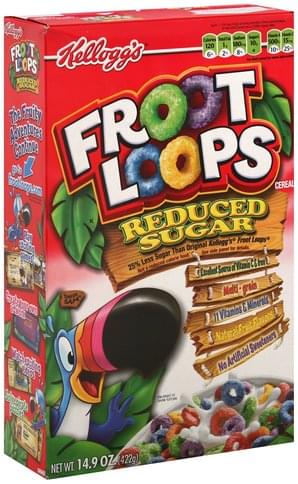Froot Loops* Cereal | Kellogg's Canada Froot Loops* Cereal. Froot Loops* cereal is packed with a delicious fruity taste, fruity aroma, and fun colours. Bursting with natural fruit flavours and no artificial colours! Select Pack Size. View SmartLabel. Calories in Fruit Loops - Nutritionix Fruit Loops Nutrition Facts Fruit Loops Serving Size: cup (29g ) Amount Per Serving Calories from Fat 8.9 Calories 109 % Daily Value* 2 % Total Fat 1g 3 % Saturated Fat 0.5g Trans Fat 0g Polyunsaturated Fat 0.3 g Monounsaturated Fat 0.2 g 0 % Cholesterol 0mg 6 % Sodium 136mg 1 % Potassium 34mg 9 % Total Carbohydrates 26g 11 % Dietary Fiber 2.7g Kellogg's® Froot Loops® Cereal - SmartLabel™ Kellogg's® Froot Loops® Cereal Nutrition Ingredients Allergens Features & Benefits Company, Brand & Sustainability 80 Calories 0 g Sat Fat 110 mg Sodium 7 g Sugar Nutrition Facts Servings Per Container 1 Serving Size 1 Container (21 g) Fruit Loops Label - This Nutrition Fruit Loops Label. Author: Alexander Bruni Last Updated: August 08, 2022. Learn more information about fruit loops label.