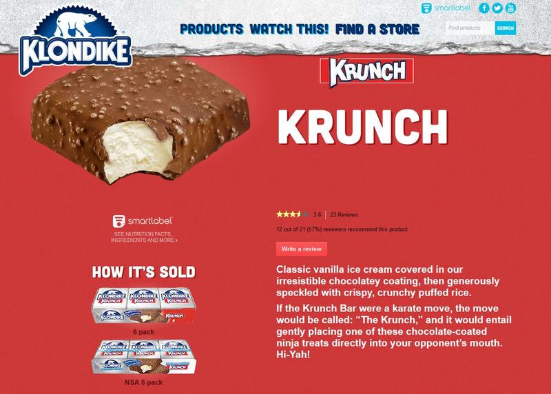 Klondike Krunch Ice Cream Bars Allergy and Ingredient Information Klondike Krunch Ice Cream Bars Light vanilla ice creamCrispy rice piecesThick shell, UPC Code 075856001204 Manufactured by Unilever. Allergen Inside Helping You Shop & Eat Safer. ... Nutrition Label. Nutrition Facts. Serving Size 1.00 bar. Amount Per Serving. Calories 250 Calories from Fat 130 % Daily Value* Total Fat 14g. 21.53%. Saturated Fat ...
