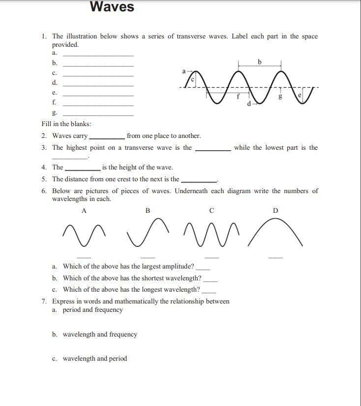 PDF WORKSHEET - LABELING WAVES - Physical Science Waves and Wave Properties Lesson—Anatomy of a Wave Worksheet WORKSHEET - LABELING WAVES 1. The highest point on a wave is the _____, while the lowest point is the _____. 2. The _____ of a wave is a measure of the amount of energy it carries. 3. The distance from one crest to the next crest is the _____. 4.