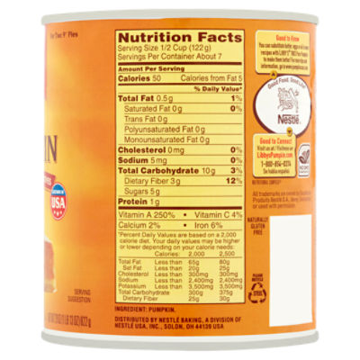 100% Pure Pumpkin Puree 15 oz | LIBBY'S® - VERY BEST BAKING It's all-natural, gluten-free, no GMO Ingredients.* *SGS verified the Nestlé process for manufacturing this product with No GMO ingredients sgs.com/no-gmo. While it is used in our famous LIBBY'S® Pumpkin Pie, it also makes delicious pancakes, smoothies, soups, pastas, pumpkin spice lattes, and more sweet and savory recipes. Calories in Libby's 100% Pure Pumpkin and Nutrition Facts - FatSecret There are 45 calories in 1/2 cup (122 g) of Libby's 100% Pure Pumpkin. Get full nutrition facts for other Libby's products and all your other favorite brands. ... you how much a nutrient in a serving of food contributes to a daily diet. 2,000 calories a day is used for general nutrition advice. Is this information inaccurate or incomplete? ... Pure Pumpkin Puree - Nutrition Facts - recipal.com Nutrition facts label and information for Pure Pumpkin Puree - Per 100 grams: 26.667 calories, 0.0g fat, 6.667g carbohydrate, 1.333g protein. ... Nutrition Label Software FDA and CFIA compliant nutrition labels. Inventory Lot tracing, inventory management, and production planning. Hire a Labeling Expert Label reviews and consulting from experts Great Value 100% Pure Pumpkin - Fooducate Personalized health review for Great Value 100% Pure Pumpkin: 50 calories, nutrition grade (A), problematic ingredients, and more. Learn the good & bad for 250,000+ products. ... 365 Everyday Value Pumpkin - 100% Pure; Libby's 100% Pure Pumpkin, Organic; Birds Eye Protein Blends, Italian Style, Steamfresh; Birds Eye Power Blend, Southwest Style ...