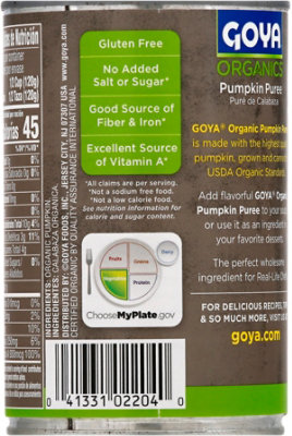 Pumpkin puree, pumpkin by Goya Foods, Inc. nutrition facts and analysis. Pumpkin puree, pumpkin by Goya Foods, Inc. contains 0 g of saturated fat and 0 mg of cholesterol per serving. 120 g of Pumpkin puree, pumpkin by Goya Foods, Inc. contains 1.70 mg of iron, 30.00 mg of calcium, 250 mg of potassium. Pumpkin puree, pumpkin by Goya Foods, Inc. belong to 'Canned Vegetables' food category.