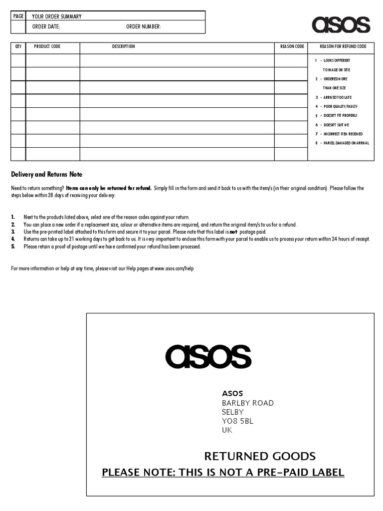 rest-of-world---returns-note.pdf - ASOS REASON FOR REFUND CODE. ASOS. BARLBY ROAD. SELBY. YO8 5BL. UK. RETURNED GOODS. PLEASE NOTE: THIS IS NOT A PRE-PAID LABEL. Next to the products listed above, ...