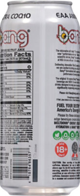 Bang Energy Drink Ingredients Label (Facts) - REIZECLUB According to the ingredients label on the back of a can of Bang energy drink, there is 300mg of caffeine, EAA's (essential amino acids), CoQ10, sodium, magnesium, vitamin C, B group vitamins, and several other ingredients present in each 16 fl.oz can. Bang is also sugar-free and doesn't contain any calories.