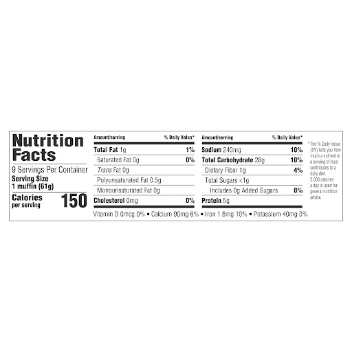 30006 Plain, Clean Label, 3oz, Forksplit, English Muffin | Burry Foods 30006 Plain, Clean Label, 3oz, Forksplit, English Muffin ... The % Daily Value (DV) tells you how much a nutrient in a serving of food contributes to a ... English Muffins, Whole Grain White, Sliced, 3.5" (#802) - Bake Crafters Nutrition facts & information for Bake Crafters product #802 — English Muffins, Whole Grain White, Sliced, 3.5" — including calories, carbs, sugar, ... Thomas' English Muffins Original - 6 ct - Stop & Shop Per 1 Muffin: 150 calories; 0 g sat fat (0% DV); 240 mg sodium (10% DV); less than 1 g total sugars. Bakeries at: Frederick, MD; Placentia, CA; Greenwich, CT; ...
