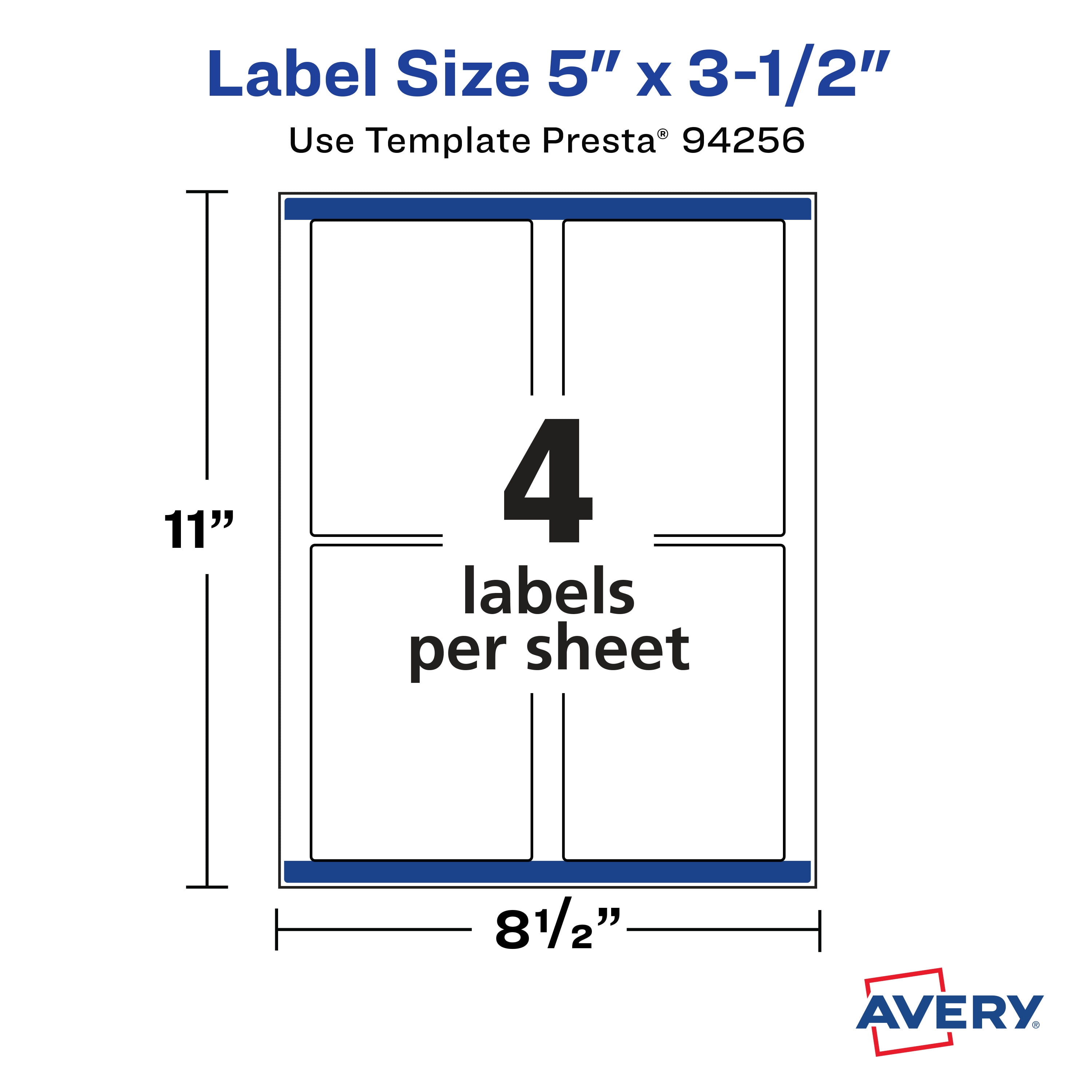Avery presta labels. Template for Google Docs compatible with Avery® Presta 94107 Avery US Letter - Presta 94107 Blank Square Labels: It has 12 labels per sheet and print in US Letter. Disclaimer Templates provided herein are compatible with different labels providers, including Avery®, SheetLabels.com, OnlineLabels.com, Herma and others. Avery Waterproof Round Labels with Sure Feed, Print to the Edge, 3 ... The free browser-based software has everything you need to design beauty product labels, cosmetic labels, thank you labels, soap labels, hand sanitizer labels, bath salt labels and more. Try it out today on the Avery site. Please Note: Print is only waterproof when used with laser printers or pigment ink printers. Print your own labels and stickers on Avery Presta 94266 blank sheets No need to download the Avery Presta 94266 template from Avery. Simply upload your artwork and print directly on labels and stickers. 3-1/3" x 4" Printable Labels - By the Sheet in 25 Materials - Avery Products Blank Labels Rectangle Labels 94215 Call Us: (800) 942-8379 Monday to Friday 6am - 5pm PT No Minimum Orders Free Templates & Designs Free Shipping Over $50 3-1/3" x 4" Blank Rectangle Labels Click image above for label details Helpful Resources Template for this Product Compare Materials Template Support Measuring Guide