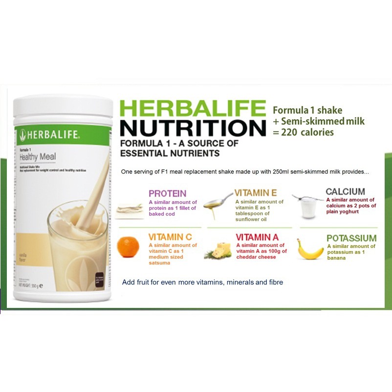 Formula 1 herbalife nutrition facts. Core Nutrition Formula 1 | Herbalife Nutrition U.S. Core Nutrition Formula 1 | Herbalife Nutrition U.S. FORMULA 1 Treat your body to a healthy, balanced meal in no time! Not only are these shakes easy to make, they’re also delicious. With 21 essential vitamins and minerals – and in a variety of flavors – weight management never tasted so good! Formula 1 Formula 2 Formula 3 Calories Healthy Meal - Herbalife Nutrition Formula 1 2 scoops 2 scoops 2 scoops Protein Drink Mix (PDM) 2 scoops 1 scoop 8 fl oz Water 8 fl oz Nonfat Milk Protein 24g 17g 17g Calories 200 170 150 Herbalife Nutrition Also Recommends: Use with Formula 2 Multivitamin Complex and Formula 3 Cell Activator®, to complete the Herbalife Nutrition® Core Cellular Nutrition program. Formula 1 Healthy Meal Nutritional Shake Mix What Is It? Formula 1 Express Meal Bar Herbalife Unique Solution • Scientifically formulated to be a nutritious meal with balanced nutrition, providing 200 calories per serving. • Use with Formula 2 Multivitamin Complex and Formula 3 Cell Activator to complete the Herbalife Core Cellular Nutrition Program.